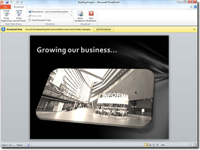 - Broadcast your slide show to people in other locations, whether or not they have PowerPoint installed.2 Create a video of your presentation—including your transitions, animations, narration, and timings—to share with virtually anyone, any time after your live broadcast.