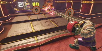 The player holds one Joy-Con in each hand and throws left and right punches at the opponent. Characters can jump and dash, and players can bend their punches by twisting their hands as they swing. One of the biggest features is the ability to equip two types of customisable ARMS per fighter. These ARMS range from standard gloved ARMS to curved weapons like boomerangs. Each arm has a special attribute like fire, ice or electricity that activates when delivering a charge punch.