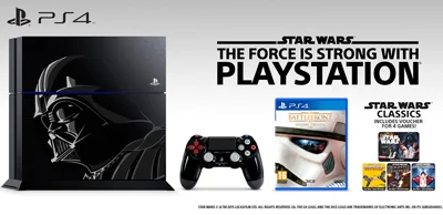 The Limited Edition Star Wars Battlefront PS4 Bundle will include a custom 1TB limited edition edition PS4 system and DualShock 4 wireless controller inspired by Darth Vader. The fully customized PS4 features an image of Darth Vader, as well as a repeated Star Wars logo etching across the top of the system. The Darth Vader edition DualShock 4 is inspired by Darth Vader's suit and features the repeated Star Wars logo on the Dual Shock 4’s touchpad.