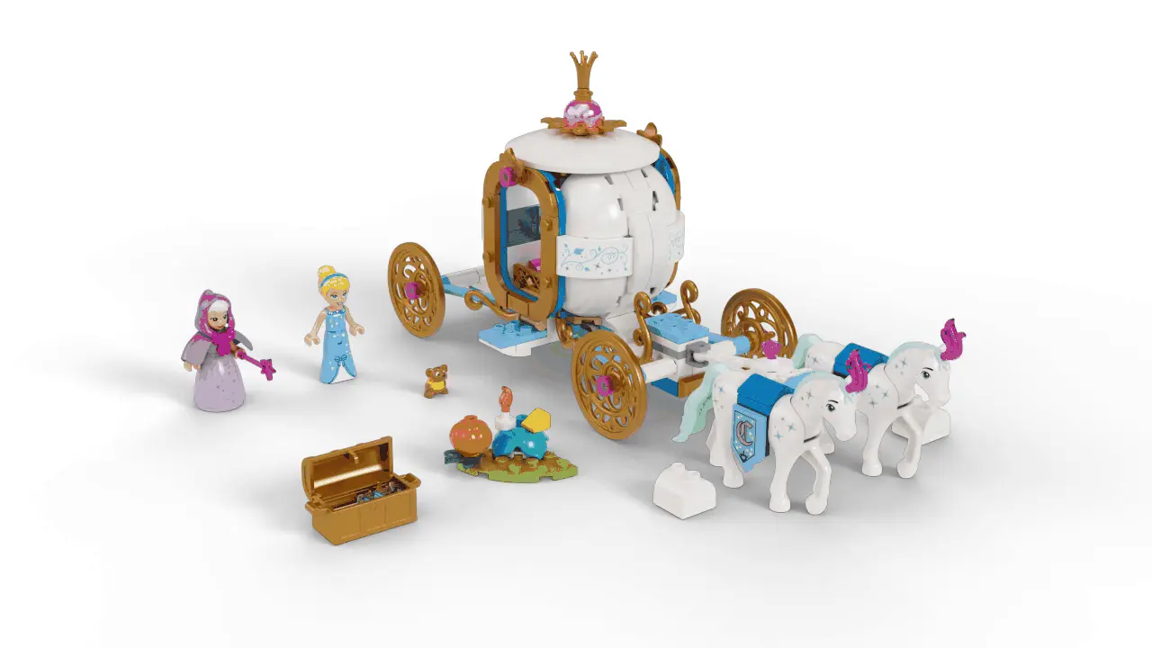• Includes 2 minidolls: Cinderella and the Fairy Godmother, Gus Gus the mouse, and the gold and white Royal Carriage has 2 LEGO horse figures