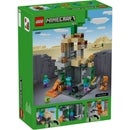 The LEGO Minecraft toy is set in the game's desert biome, and features a Wastelands Wanderer LEGO Minecraft minifigure equipped with a diamond pickaxe, mace and netherite armour – a slime and 3 Minecraft zombie figures, including one with enchanted leggings and gold sword and one with diamond helmet. Hands-on features include a rotating, zombie-spawning chamber and a sliding piece that triggers a rockfall. Other accessories to inspire imaginative play include a crafting table, torch and a chest containing bread, bone and rotten flesh.